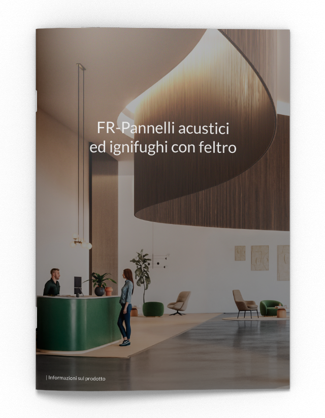 Gli unici pannelli acustici approvati contro il fuoco nell’industria con design a doghe in feltro. Il nostro feltro in poliestere appositamente progettato è l’essenza dei nostri innovativi pannelli acustici resistenti al fuoco con design a doghe, segnando una pietra miliare nella costruzione approvata contro il fuoco. Questo feltro unico è la base per il primo pannello acustico ignifugo dell’industria, con design a doghe, per il montaggio su pareti e soffitti, che soddisfa i requisiti più severi secondo le attuali norme europee EN 13823 / Classe B.
